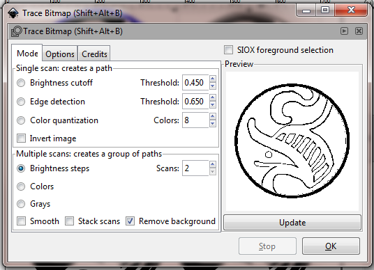 In this menu there are a bunch of options. Make sure your imported bitmap graphic is selected before you go to the trace bitmap menu. You will see a preview. After you chose your settings, click OK and an auto-traced vector will appear on top of your drawing. The "trace bitmap" window will show until you close it.
