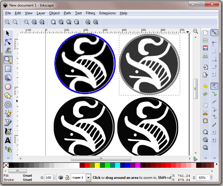 The top left is the original imported bitmap, the others are auto-traced. Since I don't want the blue outline to be part of the etched design, I'm going to use the version with two grays and tweak it to look how I want.